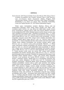 Dalam upaya meningkatkan produksi Budidaya Pakcoy kali ini menggunakan penunjang nutrisi berupa Pupuk Organik Cair (POC). POC merupakan pupuk berfrasa cair yang dibuat dari bahan-bahan organik melalui proses pengomposan sehingga pakcoy putih akan banyak diminati konsumen karena mengunakan POC alami terhadap tanaman tersebut dengan sayuran yang segar. Penelitian ini bertujuan untuk : Penelitian ini bertujuan untuk : 1). Untuk mengetahui pengaruh media tanam terhadap pertumbuhan dan produksi tanaman pakcoy putih (Brassica rapa var. chinensis) pada system guyurponik. 2). Untuk mengetahui pengaruh macam POC sebagai nutrisi terhadap pertumbuhan dan produksi tanaman pakcoy putih (Brassica rapa var. chinensis) pada system guyurponik. 3). Untuk mengetahui interaksi antara media tanam dan macam POC sebagai nutrisi terhadap pertumbuhan dan produksi tanaman pakcoy putih (Brassica rapa var. chinensis) pada system guyurponik. Hipotesis : 1). Media tanam berpengaruh terhadap pertumbuhan dan produksi tanaman pakcoy putih (Brassica rapa var. chinensis) pada hidroponik sistem guyurponik. 2). Macam POC sebagai nutrisi berpengaruh terhadap pertumbuhan dan produksi tanaman pakcoy putih (Brassica rapa var.chinensis) pada hidroponik sistem guyurponik. 3). Terjadi interaksi media tanam dan macam POC sebagai nutisi terhadap pertumbuhan dan produksi tanaman pakcoy putih (Brassica rapa var. chinensis) pada hidroponik sistem guyurponik. Penelitian ini menggunakan Rancangan Acak Kelompok (RAK) Faktorial dengan 2 faktor yaitu macam media tanam(M) sebanyak 4 taraf perlakuan dan macam POC(P) sebanyak 3 taraf perlakuan dengan 3 kelompok ulangan. Apabila hasil uji F menunjukkan pengaruh yang nyata maka analisis dilanjutkan Uji BNT pada taraf 5%. Kesimpulan hasil penelitian menunjukan: 1)Perlakuan Media Tanam memberikan pengaruh nyata terhadap pertumbuhan tanaman pakcoy putih, pada parameter saat panjang tanaman hasil terbaik menunjukan 1). Perlakuan M1 (cocopeat dilakukan dari 7 HST). Pada parameter Panjang tanaman terbaik menunjukan perlakuan M1 (Ccocopeat dilakukan 14 HST) saat umur 35 HST dan saat umur 42 HST. Pada parameter Jumlah Daun hasil terbaik menunjukan perlakuan M1. Pada parameter rangkasan basah hasil terbaik menunjukan perlakuan M1. 2). Perlakuan Brangkasan kering pada perlakuan M1 memberikan pengaruh nyata terhadap pertumbuhan pakcoy putih menunjukan hasil terbaik pada rerata POC Limbah ikan 3). Terdapat pengaruh interaksi antara Media Tanam dan Macam POC terhadap pertumbuhan tanaman pakcoy putih pada rerata Panjang Tanaman saat umur 14 HST dengan hasil terbaik pada M1P2 (media tanam dilakukan 7 HST dan POC diaplikasikan pada saat 14 HST).