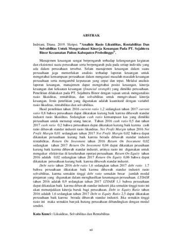 INDRIANI, DIANA (2019) ANALISIS RASIO LIKUIDITAS, RENTABILITAS DAN SOLVABILITAS UNTUK MENGEVALUASI KINERJA KEUANGAN PADA PT. SEJAHTERA BINOR KECAMATAN PAITON KABUPATEN PROBOLINGGO. Skripsi thesis, Universitas Panca Marga.