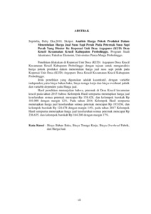 Penelitian dilakukan di Koperasi Unit Desa (KUD) Argopuro Desa Krucil Kecamatan Krucil Kabupaten Probolinggo dengan tujuan untuk menganalisis harga pokok produksi dalam menentukan harga jual susu sapi perah pada Koperasi Unit Desa (KUD) Argopuro Desa Krucil Kecamatan Krucil Kabupaten Probolinggo. Jenis penelitian yang digunakan adalah kuantitatif, dengan variable independen yaitu biaya bahan baku, biaya tenaga kerja dan biaya overhead pabrik dan variable dependen yaitu Harga jual. Hasil penelitian menunjukan bahwa, peternak di Desa Krucil kecamatan krucil pada tahun 2015 bahwa Kelompok Hasil sempurna menetapkan harga jual keseluruhan semua peternak mencapai Rp 158.428, dan kelompok barokah Rp 101.000 dengan margin 12%, Pada tahun 2016 Kelompok Hasil sempurna menetapkan harga jual keseluruhan semua peternak mencapai Rp 193.036, dan kelompok barokah Rp 124.678 dengan margin 14%, pada tahun 2017 Kelompok Hasil sempurna menetapkan harga jual keseluruhan semua peternak mencapai Rp 236.635, dan kelompok barokah Rp 164.240 dengan margin 17%.
