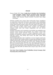 Perbankan memiliki peran strategis dalam perekonomian dengan menghimpun dan menyalurkan dana kepada masyarakat, yang bertujuan untuk meningkatkan taraf hidup rakyat. Salah satu cara untuk menilai kinerja keuangan bank adalah melalui analisis laporan keuangan, dengan fokus pada analisis rasio likuiditas dan profitabilitas. Rasio likuiditas digunakan untuk mengukur kemampuan bank dalam memenuhi kewajiban jangka pendek, sementara rasio profitabilitas mengukur sejauh mana bank mampu menghasilkan laba dari aktivitas operasionalnya. Penelitian ini bertujuan untuk menganalisis rasio likuiditas dan profitabilitas guna mengukur kinerja keuangan bank pemerintah yang terdaftar di Bursa Efek Indonesia selama periode 2019-2021. Dengan menggunakan analisis rasio, penelitian ini memberikan gambaran mengenai kesehatan dan kinerja keuangan bank-bank tersebut, yang penting bagi investor dan pihak terkait dalam mengambil keputusan. Hasil penelitian diharapkan dapat memberikan wawasan mengenai sejauh mana bank-bank BUMN dapat menjaga stabilitas keuangan dan memberikan kontribusi terhadap perekonomian nasional. Kinerja keuangan LDR Bank BNI tahun 20192021 cukup sehat dengan presentase rata-rat 85% keatas, sedangkan pada Bank BRI rata-rata presentase tahun 2019-2021 cukup sehat dengan presentase 84,5%. Kemudian pada Bank Mandiri cukup sehat pada tahun 2019-2020, sedangkan di tahun 2021 kurang sehat karena 100,2% Bank BRI dan Bank Mandiri. Untuk nilai ROA pada Bank BNI, BRI dan Mandiri dalam kategori sangat sehat dari tahun 2019-2021.