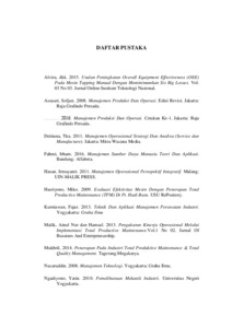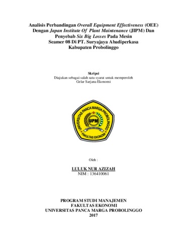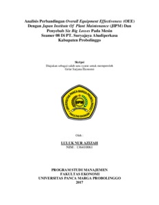 AZIZAH, LULUK NUR (2017) Analisis Perbandingan Overall Equipment Effectiveness (OEE) Dengan Japan Institute Of Plant Maintenance (JIPM) Dan Penyebab Six Big Losses Pada Mesin Seamer 08 Di PT. Suryajaya Abadiperkasa Kabupaten Probolinggo. Skripsi thesis, Universitas Panca Marga.