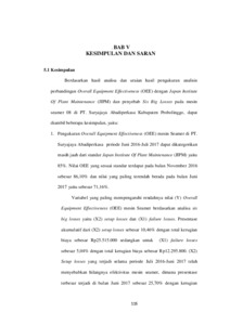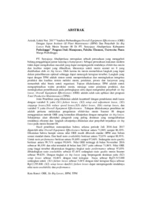 PT. Suryajaya Abadiperkasa merupakan sebuah perusahaan yang menggeluti bidang penggalengan jamur kancing (champignon). Sebagai perusahaan makanan modern tidak dapat mengabaikan masalah yang dapat mempengaruhi rendahnya efektivitas mesin dan kualitas output yang dihasilkan, khususnya untuk mesin seamer no 8 yang diakibatkan oleh six big losses. Oleh karena itu mesin memerlukan langkah yang tepat dalam pemeliharaan optimal sehingga dapat mencegah kerugian tersebut. Langkah yang tepat dengan TPM adalah sistem untuk mempertahankan dan meningkatkan integritas produksi dan kualitas sistem melalui mesin, peralatan, proses dan karyawan yang menambah nilai bisnis untuk organisasi. Tujuan dilakukannya TPM adalah untuk mengoptimalkan waktu produksi mesin, menjaga umur peralatan produksi, dan meningkatkan pemeliharaan pada perlengkapan serta dapat mengetahui penyebab six big losses. Overall Equipment Effectiveness (OEE) adalah salah satu aplikasi dari program Total Productive Manintenance (TPM). Jenis Penelitian yang dilakukan adalah kuantitatif dengan pendekatan studi kasus dengan variabel X yaitu (X1) failure losses, (X2) setup and adjustment losses, (X3) stoppage losses,(X4) reduce speed losses,(X5) defect losses, (X6) startup losses, dan variabel Y yaitu Overall Equipment Effectiveness . Tahapan dilakukannya penelitian ini adalah pertama melakukan pengukuran efektivitas mesin Seamer 08 dengan menggunakan metode OEE yang kemudian dilanjutkan dengan mengukur six big losses. Selanjutnya akan diketahui pengaruh yang paling dominan yang mengakibatkan rendahnya efisiensi dan langkah selanjutnya dilakukan akar penyebab terjadinya six big losse pada mesin Seamer 08. Hasil penelitian menunjukkan bahwa selama periode Juli 2016-Juni 2017 diperoleh nilai Overall Equipment Effectiveness berkisar antara 71,06% sampai 86,10%. Dikatakan bahwa hampir semua nilai OEE masih dibawah standar JIPM atau belum sesuai standart dunia. Dan hasil rasio availability berkisar antara 72,83% sampai 88,93%. Untuk rasio performance berkisar antara 91,60% sampai 97,66%. Sedangakn rasio quality berkisar antara 99,71% sampai 99,84%. Nilai OEE tertinggi di bulan November 2016 sebsesar 86,10% dan nilai terendah di bulan Juni 2017 yaitu sebesar 71,06%. Nilai OEE yang tinggi tersebut dikarenakan tingginya tingkat rasio performamce sebesar 97,05% dibandingkan rasio availability sebesar 87,44% sedangkan rasio quality mesin Seamer sebesar 99,82%. Dengan tingkat six big losses yang berpengaruh dominan yaitu (X2) setup losses sebesar 10,46% dengan total kerugian biaya sebesar Rp25.515.000 sedangkan untuk (X1) failure losses sebesar 5,04% dengan total kerugian biaya sebesar Rp12.295.800. (X2) setup losses dan(X1) failure losses dapat mempengaruhi rendahnya nilai rasio availability dan performance.