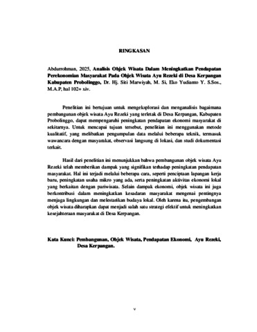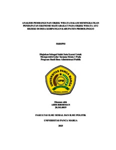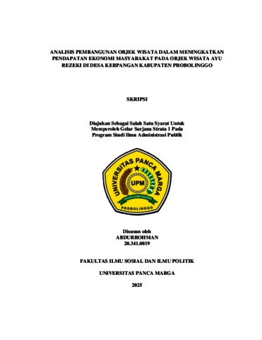 ABDURROHMAN, (2025) ANALISIS PEMBANGUNAN OBJEK WISATA DALAM MENINGKATKAN PENDAPATAN EKONOMI MASYARAKAT PADA OBJEK WISATA AYU REZEKI DI DESA KERPANGAN KABUPATEN PROBOLINGGO. Skripsi thesis, Universitas Panca Marga.