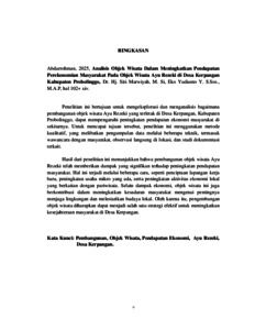 Penelitian ini bertujuan untuk mengeksplorasi dan menganalisis bagaimana pembangunan objek wisata Ayu Rezeki yang terletak di Desa Kerpangan, Kabupaten Probolinggo, dapat mempengaruhi peningkatan pendapatan ekonomi masyarakat di sekitarnya. Untuk mencapai tujuan tersebut, penelitian ini menggunakan metode kualitatif, yang melibatkan pengumpulan data melalui beberapa teknik, termasuk wawancara dengan masyarakat, observasi langsung di lokasi, dan studi dokumentasi terkait. Hasil dari penelitian ini menunjukkan bahwa pembangunan objek wisata Ayu Rezeki telah memberikan dampak yang signifikan terhadap peningkatan pendapatan masyarakat. Hal ini terjadi melalui beberapa cara, seperti penciptaan lapangan kerja baru, peningkatan usaha mikro yang ada, serta peningkatan aktivitas ekonomi lokal yang berkaitan dengan pariwisata. Selain dampak ekonomi, objek wisata ini juga berkontribusi dalam meningkatkan kesadaran masyarakat mengenai pentingnya menjaga lingkungan dan melestarikan budaya lokal. Oleh karena itu, pengembangan objek wisata diharapkan dapat menjadi salah satu strategi efektif untuk meningkatkan kesejahteraan masyarakat di Desa Kerpangan.
