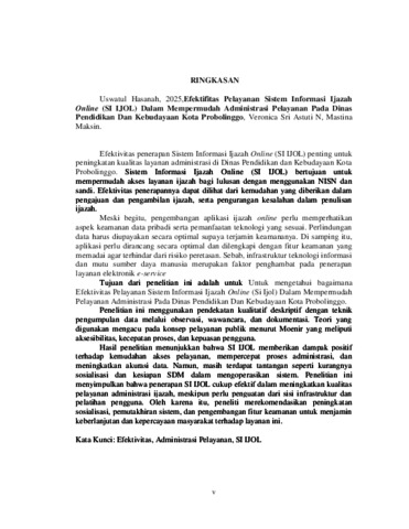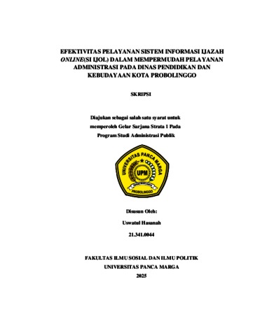 Hasanah, Uswatul (2025) EFEKTIVITAS PELAYANAN SISTEM INFORMASI IJAZAH ONLINE(SI IJOL) DALAM MEMPERMUDAH PELAYANAN ADMINISTRASI PADA DINAS PENDIDIKAN DAN KEBUDAYAAN KOTA PROBOLINGGO. Skripsi thesis, Universitas Panca Marga.