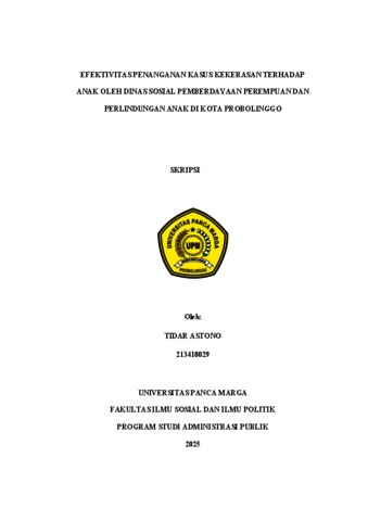 ASTONO, TIDAR (2025) EFEKTIVITAS PENANGANAN KASUS KEKERASAN TERHADAP ANAK OLEH DINAS SOSIAL PEMBERDAYAAN PEREMPUAN DAN PERLINDUNGAN ANAK DI KOTA PROBOLINGGO. Skripsi thesis, Universitas Panca Marga.