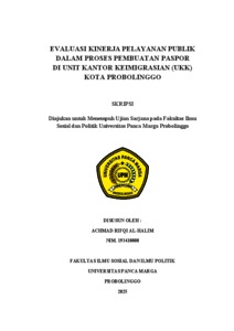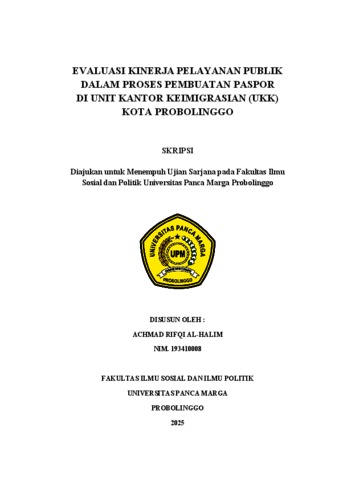 AL-HALIM, ACHMADRIFQI (2025) EVALUASIKINERJAPELAYANANPUBLIK DALAMPROSESPEMBUATANPASPOR DIUNITKANTORKEIMIGRASIAN(UKK) KOTAPROBOLINGGO. Skripsi thesis, Universitas Panca Marga.