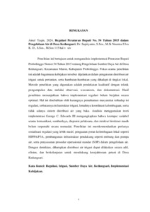 Penelitian ini bertujuan untuk menganalisis implementasi Peraturan Bupati Probolinggo Nomor 54 Tahun 2015 tentang Pengelolaan Sumber Daya Air di Desa Kedungsari, Kecamatan Maron, Kabupaten Probolinggo. Fokus utama penelitian ini adalah bagaimana kebijakan tersebut dijalankan dalam pengaturan distribusi air irigasi untuk pertanian, serta hambatan-hambatan yang dihadapi di tingkat lokal. Metode penelitian yang digunakan adalah pendekatan kualitatif dengan teknik pengumpulan data melalui observasi, wawancara, dan dokumentasi. Hasil penelitian menunjukkan bahwa implementasi regulasi belum berjalan secara optimal. Hal ini disebabkan oleh kurangnya pemahaman masyarakat terhadap isi regulasi, terbatasnya infrastruktur irigasi, lemahnya koordinasi kelembagaan, serta tidak adanya sistem distribusi air yang baku. Analisis menggunakan teori implementasi George C. Edwards III mengungkapkan bahwa keempat variabel utama komunikasi, sumberdaya, disposisi pelaksana, dan struktur birokrasi masih belum terpenuhi secara memadai. Penelitian ini merekomendasikan perlunya sosialisasi regulasi yang lebih masif, penguatan peran kelembagaan lokal seperti HIPPA/P3A, pembangunan infrastruktur pendukung seperti embung dan pompa air, serta penyusunan prosedur operasional standar (SOP) dalam pengelolaan air. Dengan demikian, diharapkan distribusi air irigasi dapat dilakukan secara adil, efisien, dan berkelanjutan untuk mendukung kesejahteraan petani di Desa Kedungsari.