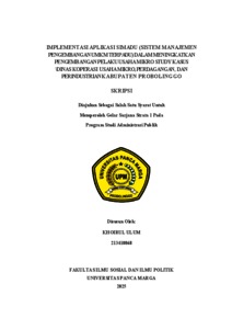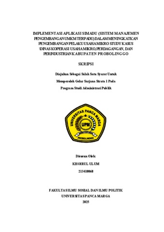 ULUM, KHOIRUL (2025) IMPLEMENTASI APLIKASI SIMADU (SISTEM MANAJEMEN PENGEMBANGAN UMKM TERPADU) DALAM MENINGKATKAN PENGEMBANGAN PELAKU USAHA MIKRO STUDY KASUS \DINAS KOPERASI USAHA MIKRO, PERDAGANGAN, DAN PERINDUSTRIAN KABUPATEN PROBOLINGGO. Skripsi thesis, Universitas Panca Marga.