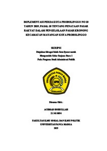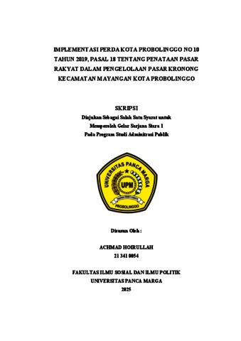 HOIRULLAH, ACHMAD (2025) IMPLEMENTASI PERDA KOTA PROBOLINGGO NO 10 TAHUN 2019, PASAL 18 TENTANG PENATAAN PASAR RAKYAT DALAM PENGELOLAAN PASAR KRONONG KECAMATAN MAYANGAN KOTA PROBOLINGGO. Skripsi thesis, Universitas Panca Marga.