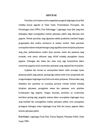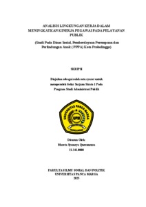Queennensa, Mareta Syamsya (2025) ANALISIS LINGKUNGAN KERJA DALAM MENINGKATKAN KINERJA PEGAWAI PADA PELAYANAN PUBLIK (Studi Pada Dinas Sosial, Pemberdayaan Perempuan dan Perlindungan Anak ( PPPA) Kota Probolinggo). Skripsi thesis, Universitas Panca Marga.