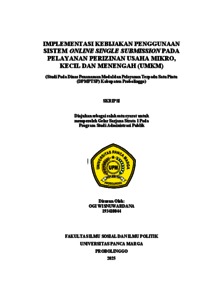 WISNUWARDANA, OGI (2025) IMPLEMENTASIKEBIJAKANPENGGUNAAN SISTEMONLINESINGLESUBMISSIONPADA PELAYANANPERIZINANUSAHAMIKRO, KECILDANMENENGAH(UMKM) (StudiPadaDinasPenanamanModaldanPelayananTerpaduSatuPintu (DPMPTSP)KabupatenProbolinggo). Skripsi thesis, Universitas Panca Marga.