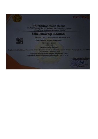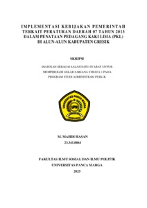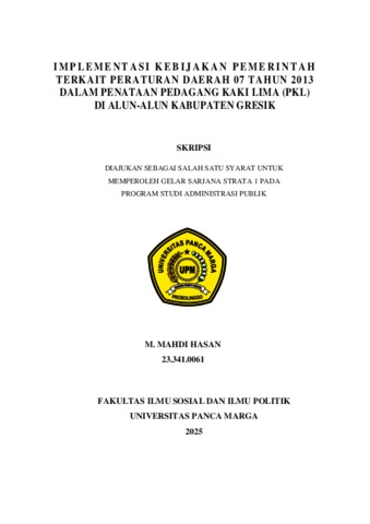 HASAN, M. MAHDI (2025) IMPLEMENTASI KEBIJAKAN PEMERINTAH TERKAIT PERATURAN DAERAH 07 TAHUN 2013 DALAM PENATAAN PEDAGANG KAKI LIMA (PKL) DI ALUN-ALUN KABUPATEN GRESIK. Skripsi thesis, Universitas Panca Marga.