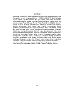Penelitian ini bertujuan untuk mengetahui pertimbangan hakim dalam putusan Pengadilan Negeri Surabaya (Nomor : 2276/Pid.B/2023/PN Sby) terhadap tindak pidana perjudian melalui situs judi online. Dan untuk mengetahui pertanggungjawaban pidana terhadap pelaku perjudian melalui situs judi online menurut Pasal 303 Ayat (1) KUHP dan Pasal 27 Ayat (2) UU Nomor 1 Tahun 2024 ITE. Metode penelitian yang digunakan adalah yuridis normatif dengan pendekatan studi kasus. Hasil analisis menunjukkan bahwa pertimbangan hakim mencakup aspek pembuktian unsur-unsur tindak pidana, alat bukti yang sah, serta kondisi subjektif dan objektif terdakwa. Selain itu, hakim juga mempertimbangkan dampak sosial dari perjudian online serta peran terdakwa dalam kejahatan tersebut. Penelitian ini menyoroti pentingnya konsistensi penerapan hukum serta perlunya penguatan regulasi dalam menghadapi kejahatan siber, khususnya perjudian daring. Pemberian hukuman pada kasus tindak pidana perjudian online harus sesuai dengan undang-undang yang berlaku dan di hukum sesui dengan aturan yang dibuat tanpa ada pengurangan yang menjadi bentuk tanggungjawab dari pelaku