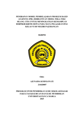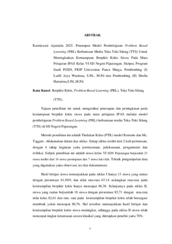 KURNIAWATI, AJUNAIDA (2025) PENERAPAN MODEL PEMBELAJARAN PROBLEM BASED LEARNING (PBL) BERBANTUAN MEDIA TEKA-TEKI SILANG (TTS) UNTUK MENINGKATKAN KEMAMPUAN BERPIKIR KRITIS SISWA PADA MATA PELAJARAN IPAS KELAS VI SD NEGERI PAJURANGAN. Skripsi thesis, Universitas Panca Marga.