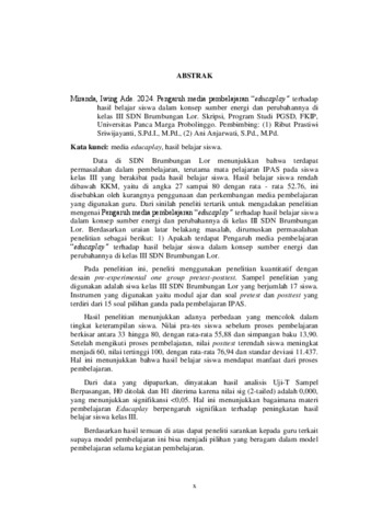 Data di SDN Brumbungan Lor menunjukkan bahwa terdapat permasalahan dalam pembelajaran, terutama mata pelajaran IPAS pada siswa kelas III yang berakibat pada hasil belajar siswa. Hasil belajar siswa rendah dibawah KKM, yaitu di angka 27 sampai 80 dengan rata - rata 52.76, ini disebabkan oleh kurangnya penggunaan dan perkembangan media pembelajaran yang digunakan guru. Dari sinilah peneliti tertarik untuk mengadakan penelitian mengenai Pengaruh media pembelajaran “educaplay” terhadap hasil belajar siswa dalam konsep sumber energi dan perubahannya di kelas III SDN Brumbungan Lor. Berdasarkan uraian latar belakang masalah, dirumuskan permasalahan penelitian sebagai berikut: 1) Apakah terdapat Pengaruh media pembelajaran “educaplay” terhadap hasil belajar siswa dalam konsep sumber energi dan perubahannya di kelas III SDN Brumbungan Lor. Pada penelitian ini, peneliti menggunakan penelitian kuantitatif dengan desain pre-experimental one group pretest-posttest. Sampel penelitian yang digunakan adalah siwa kelas III SDN Brumbungan Lor yang berjumlah 17 siswa. Instrumen yang digunakan yaitu modul ajar dan soal pretest dan posttest yang terdiri dari 15 soal pilihan ganda pada pembelajaran IPAS. Hasil penelitian menunjukkan adanya perbedaan yang mencolok dalam tingkat keterampilan siswa. Nilai pra-tes siswa sebelum proses pembelajaran berkisar antara 33 hingga 80, dengan rata-rata 55,88 dan simpangan baku 13,90. Setelah mengikuti proses pembelajaran, nilai posttest terendah siswa meningkat menjadi 60, nilai tertinggi 100, dengan rata-rata 76,94 dan standar deviasi 11.437. Hal ini menunjukkan bahwa hasil belajar siswa mendapat manfaat dari proses pembelajaran. Dari data yang dipaparkan, dinyatakan hasil analisis Uji-T Sampel Berpasangan, H0 ditolak dan H1 diterima karena nilai sig (2-tailed) adalah 0,000, yang menunjukkan signifikansi <0,05. Hal ini menunjukkan bagaimana materi pembelajaran Educaplay berpengaruh signifikan terhadap peningkatan hasil belajar siswa kelas III. Berdasarkan hasil temuan di atas dapat peneliti sarankan kepada guru terkait supaya model pembelajaran ini bisa menjadi pilihan yang beragam dalam model pembelajaran selama kegiatan pembelajaran.