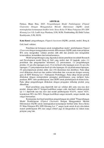 FIRDAUS, ILHAM IBNU (2025) PENGEMBANGAN MODEL PEMBELAJARAN FLIPPED CLASSROOM DENGAN MENGGUNAKAN METODE DIFFERENSIASI (SQ3R) UNTUK MENINGKATKAN KETERAMPILAN BERFIKIR KRITIS PADA PEMEBELAJARAN IPA SISWA KELAS IV SDN KLENANG LOR I KABUPATEN PROBOLINGGO. Skripsi thesis, Universitas Panca Marga.