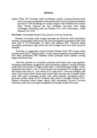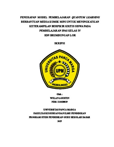 AGUSTIN, WULAN (2025) PENERAPAN MODEL PEMBELAJARAN QUANTUM LEARNING BERBANTUAN MEDIA KOMIK MINI UNTUK MENINGKATKAN KETERAMPILAN BERPIKIR KRITIS SISWA PADA PEMBELAJARAN IPAS KELAS IV SDN BRUMBUNGAN LOR. Skripsi thesis, Universitas Panca Marga.