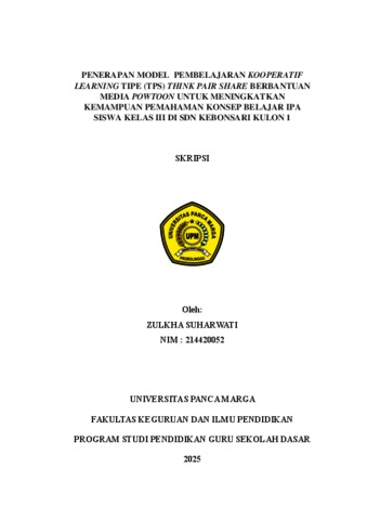 SUHARWATI, ZULKHA (2025) PENERAPAN MODEL PEMBELAJARAN KOOPERATIF LEARNING TIPE (TPS) THINK PAIR SHARE BERBANTUAN MEDIA POWTOON UNTUK MENINGKATKAN KEMAMPUAN PEMAHAMAN KONSEP BELAJAR IPA SISWA KELAS III DI SDN KEBONSARI KULON 1. Skripsi thesis, Universitas Panca Marga.