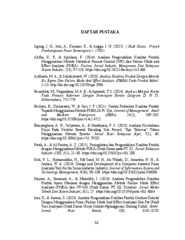 Dalam era globalisasi, industri mebel merupakan sektor bisnis yang memiliki keterkaitan erat dengan desain interior bangunan. Kualitas produk menjadi faktor utama yang menentukan keberhasilan perusahaan dalam mempertahankan dan memperluas pangsa pasar. UKM Mebel Jaya merupakan usaha kecil menengah yang bergerak di bidang produksi furnitur kayu, dengan lemari sebagai salah satu produk utamanya yang memiliki nilai jual tinggi. Namun, seiring dengan meningkatnya volume produksi, UKM ini menghadapi permasalahan berupa defect atau kegagalan produk mebel. Untuk itu, peneliti melakukan analisis terhadap faktor risiko kegagalan produk defect sebagai upaya untuk mengidentifikasi, menganalisis, dan mengendalikan risiko kegagalan produk lemari guna meningkatkan mutu produksi. Penelitian ini menggunakan metode Failure Mode and Effect Analysis (FMEA), Fault Tree Analysis (FTA), dan Bowtie Analysis (BTA). Berdasarkan hasil analisis FMEA, ditemukan tiga penyebab kegagalan utama dengan nilai Risk Priority Number (RPN) tertinggi, yaitu: aplikasi pewarna tidak konsisten (RPN 116), pengukuran tidak akurat (RPN 114), dan alat potong tumpul (RPN 111). Melalui metode FTA, peneliti berhasil mengidentifikasi akar penyebab kegagalan seperti alat potong tumpul, pengukuran tidak akurat, dan pewarnaan tidak konsisten, yang dipicu oleh minimnya standar operasional prosedur (SOP), alat kerja yang tidak sesuai standar, serta kurangnya pelatihan dan perawatan alat. Sementara itu, metode BTA digunakan untuk merancang strategi pencegahan dan mitigasi risiko secara sistematis, yaitu melalui pelatihan, penyusunan SOP, pemeriksaan akhir, dan perawatan alat guna mengendalikan potensi kegagalan produksi.