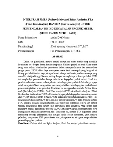 NANDA, ATIKA DWI (2025) INTEGRASI FMEA (Failure Mode And Effect Analysis), FTA (Fault Tree Analysis) DAN BTA (Bowtie Analysis) UNTUK PENGENDALIAN RISIKO KEGAGALAN PRODUK MEBEL (STUDI KASUS: MEBEL JAYA). Skripsi thesis, Universitas Panca Marga.