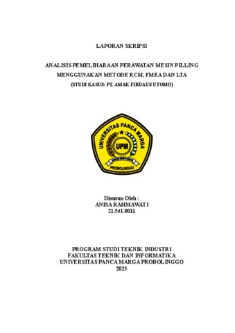 RAHMAWATI, ANISA (2025) ANALISIS PEMELIHARAAN PERAWATAN MESIN PILLING MENGGUNAKAN METODE RCM, FMEA DAN LTA (STUDI KASUS: PT. AMAK FIRDAUS UTOMO). Skripsi thesis, Universitas Panca Marga.