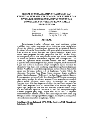 Perkembangan teknologi informasi yang pesat mendorong institusi pendidikan tinggi untuk mengadopsi sistem terintegrasi guna meningkatkan efisiensi dan efektivitas pengelolaan data akademik dan non-akademik. Fakultas Teknik dan Informatika Universitas Panca Marga menghadapi berbagai tantangan dalam administrasi umum, keuangan, dan layanan mahasiswa, seperti proses manual dalam pengajuan dispensasi, pengelolaan data BKK, asuransi, hingga dokumen penting seperti surat menyurat dan notulen rapat. Proses konvensional ini berisiko menyebabkan keterlambatan, duplikasi, dan kehilangan data. Oleh karena itu, diperlukan sistem informasi berbasis web untuk mendukung pengelolaan administrasi yang lebih cepat, akurat, transparan, dan terdokumentasi dengan baik. Sistem ini diharapkan mampu menciptakan layanan akademik dan administratif yang efisien serta mendukung pengambilan keputusan di lingkungan fakultas. Penelitian ini membahas pengembangan Sistem Informasi Administrasi Umum dan Keuangan berbasis web di lingkungan Fakultas Teknik dan Informatika Universitas Panca Marga. Sistem dirancang dengan pendekatan Unified Modeling Language (UML) seperti Use Case Diagram, Activity Diagram, dan menggunakan arsitektur Model View Controller (MVC) untuk memisahkan logika sistem, tampilan, dan interaksi pengguna. Proses pengembangan mengikuti tahapan analisis kebutuhan, desain sistem, implementasi, dan pengujian. Pengujian sistem dilakukan dengan metode Black box dan User Acceptance Test (UAT). Hasil pengujian Black box menunjukkan bahwa seluruh fungsi utama seperti login, pengelolaan data, serta fitur filter dan pencarian berjalan dengan baik tanpa kesalahan signifikan. Sementara itu, hasil UAT menunjukkan tingkat kepuasan pengguna yang tinggi, dengan skor 90,27% dari 15 responden mahasiswa dan 88% dari total 2 admin. Hasil ini menunjukkan bahwa sistem yang dibangun mendapat dukungan positif dari pengguna dan berpotensi meningkatkan efisiensi layanan administrasi di lingkungan fakultas