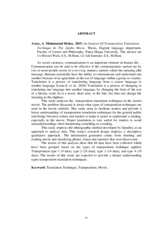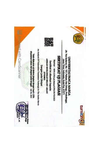 ARASY, AHMAD MUHAMMAD HELMY (2025) AN ANALYSIS OF TRANSPOSITION TRANSLATION TECHNIQUE IN THE SUBTITLE OF JUMBO MOVIE. Skripsi thesis, Universitas Panca Marga.