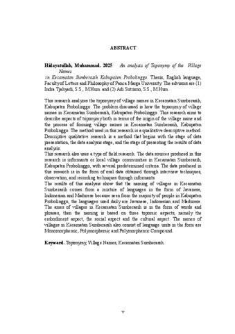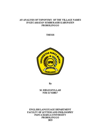M. HIDAYATULLAH, (2025) AN ANALYSIS OF TOPONYMY OF THE VILLAGE NAMES IN KECAMATAN SUMBERASIH KABUPATEN PROBOLINGGO. Skripsi thesis, Universitas Panca Marga.
